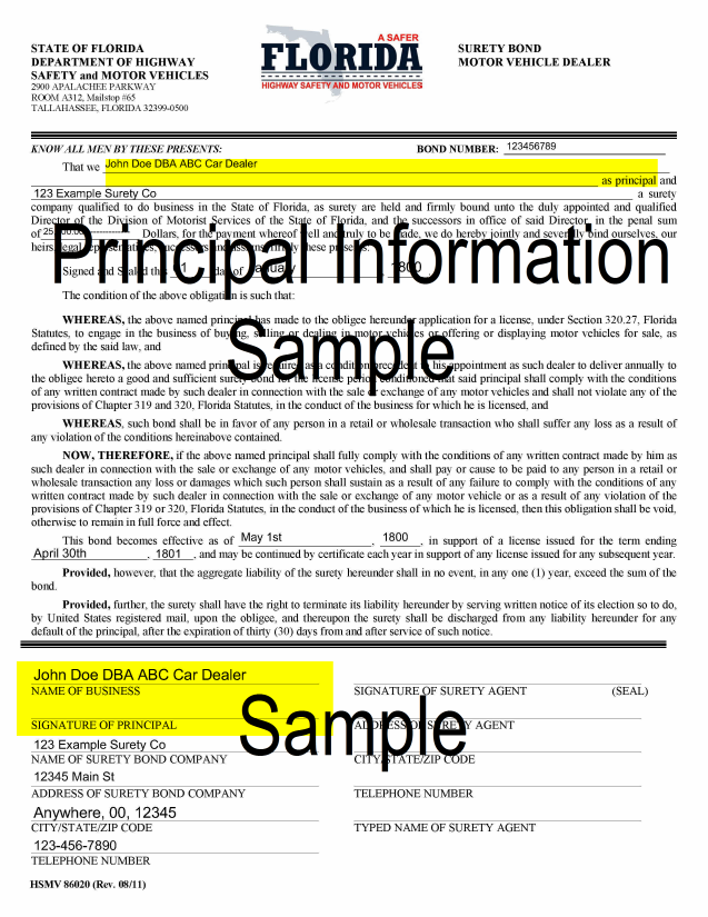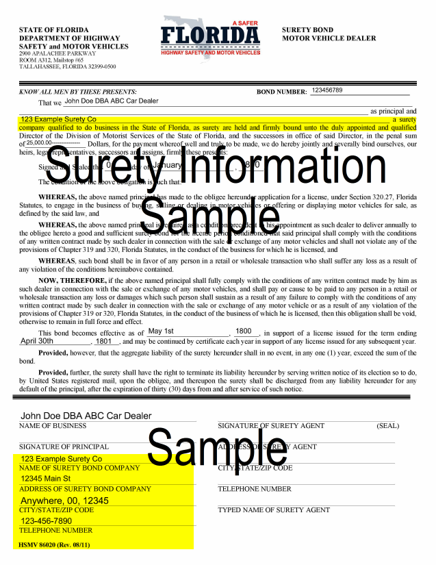 Below is a Florida Motor vehicle dealer bond form. Most bonds follow a basic format.  The Florida Dealer surety bond is good example to show what is actually getting issued. Once the bond is typed and signed and sealed by the Surety it is sent to the Principal to be signed, then the Principal sends the bond to the Obligee.